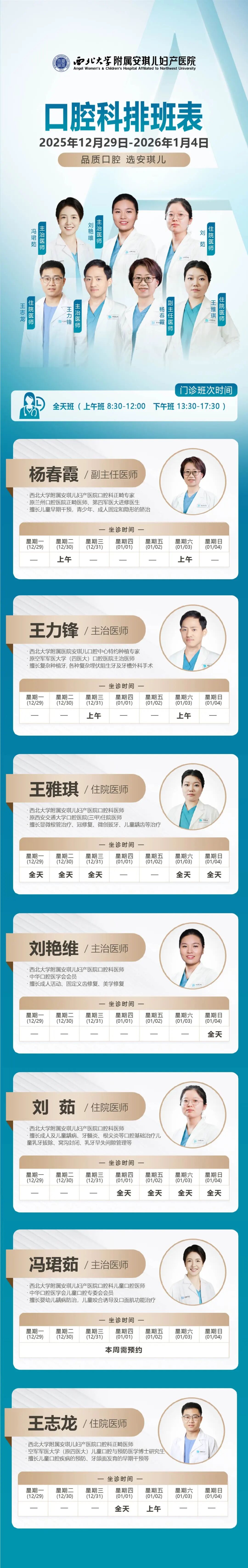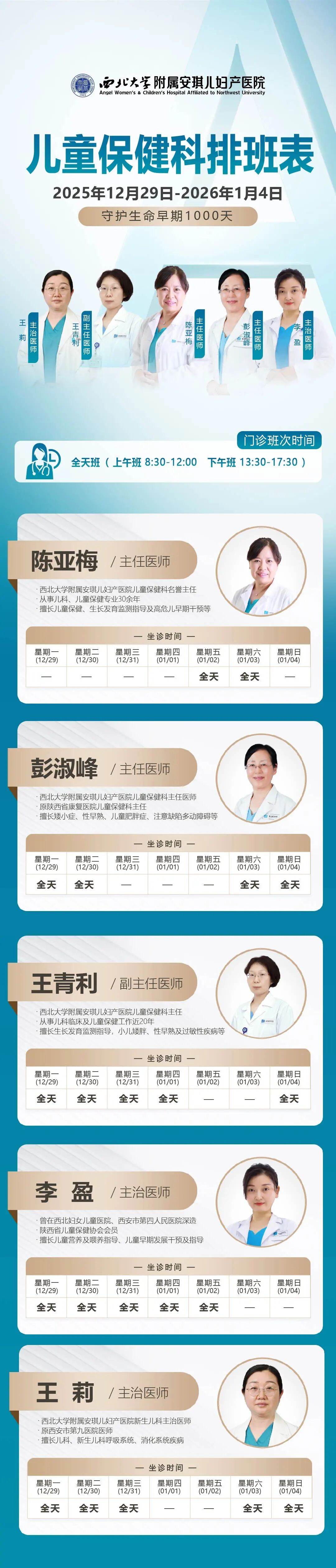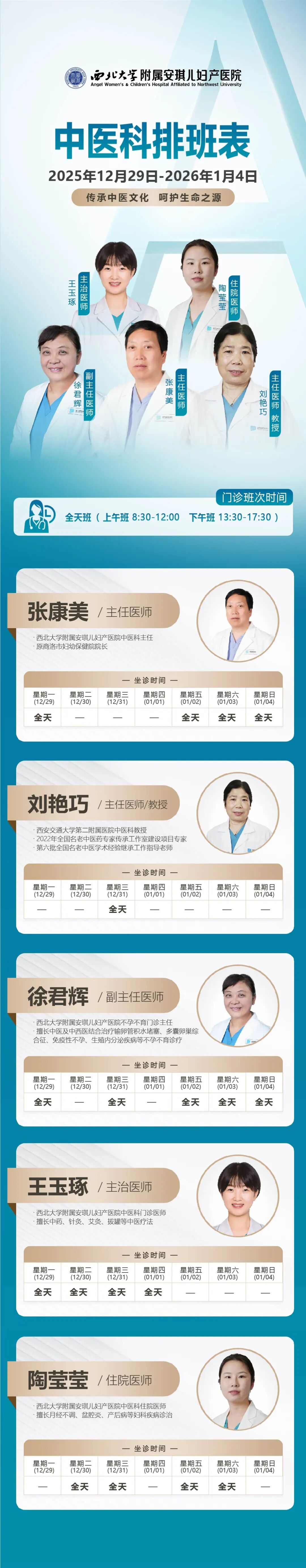西安安琪儿妇产医院(2025年12月29日至2026年1月4日)专家坐诊时间表